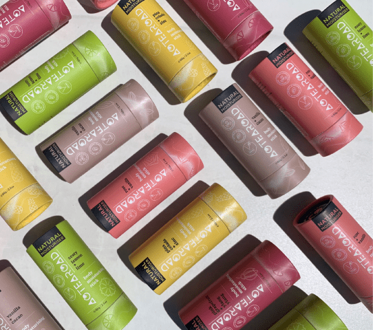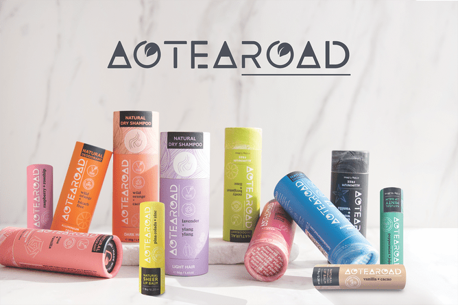While many toiletry products are wrapped in plastic, Aotearoad’s personal care products; natural deodorants, moisturizer sticks, lip balms and hair care, come in recyclable or compostable cardboard tubes.